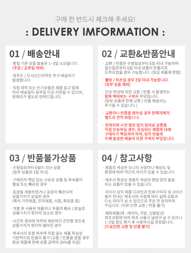 ㆍ단순변심에 의한 교환/반품은 제품 수령 후 7일 이내까지, 교환/반품 제한사항에 해당하지 않는 경우에만 가능 (배송비용과 교환/반품 비용 왕복배송비 고객부담) ㆍ상품의 내용이 표시•광고의 내용과 다른 경우에는 상품을 수령한 날부터 3개월 이내, 그 사실을 안 날 또는 알 수 있었던 날부터 30일 이내에 청약철회 가능 |